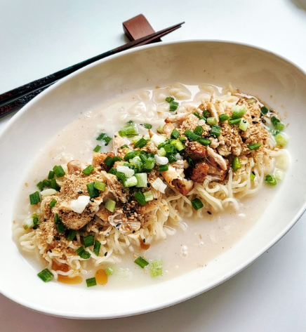 - 재료: 사리곰탕 라면 1개, 시판 닭가슴살 1봉, 식초 1t, 참기름 1숟가락, 참기름 1숟가락, 다진 대파 2숟가락, 통깨, 차가운 물 200ml