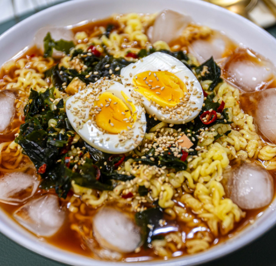 - 재료: 라면 1개, 청양고추 1개(생략가능), 물 200ml, 설탕 1큰술, 식초 1큰술, 참기름 1큰술, 면수 3큰술, 얼음